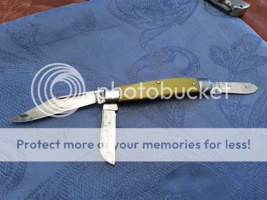 And from the "something new" pile, my second Case centennial edition daddy Barlow, a delightful departure from the usual big Barlow configuration with the typical full-length clip along with a full-length, extremely large "secondary" spey blade -- essentially a very large trapper in a swell-end frame. I spent literally months haggling over price on this one. This example has a couple blemishes from the factory when some poltergeist got into the equipment and tried to drill rocker pin holes in both scales in the wrong places. There's also a little gunk on the pile side scale but it doesn't appear to be a permanent problem. These are purely cosmetic considerations; the knife is big and bold and makes a pretty great user knife. I give you the daddy Barlow trapper (traplow?