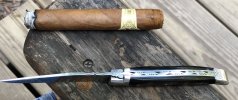 I like the Palm Tree etch also Jeff.I just now received this stunning 1st generation Frank Buster Cutlery Co. stockman in stainless and MOP. Pearl is hard to photograph, but this is the best I've ever had, with fiery luster and plenty of blues, greens, pinks and purples. I hope some of the quality comes through the lens. Great W&T as well.