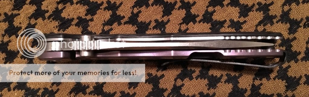 lock side anodized by previous owner. Appears to have factory sharpened bevel and is very sharp. Opens smoothly and just the right amount of detent. It has seen only very light use (opening mail and packages) while in my care.
