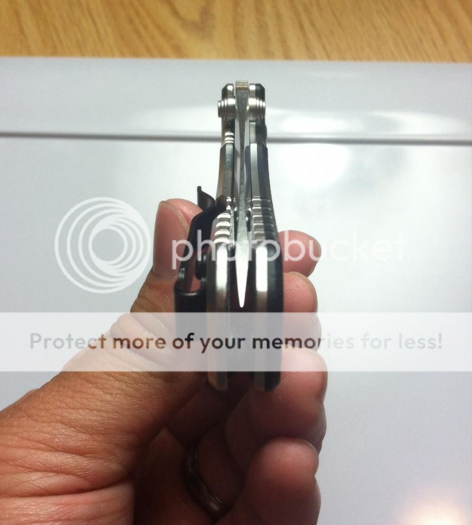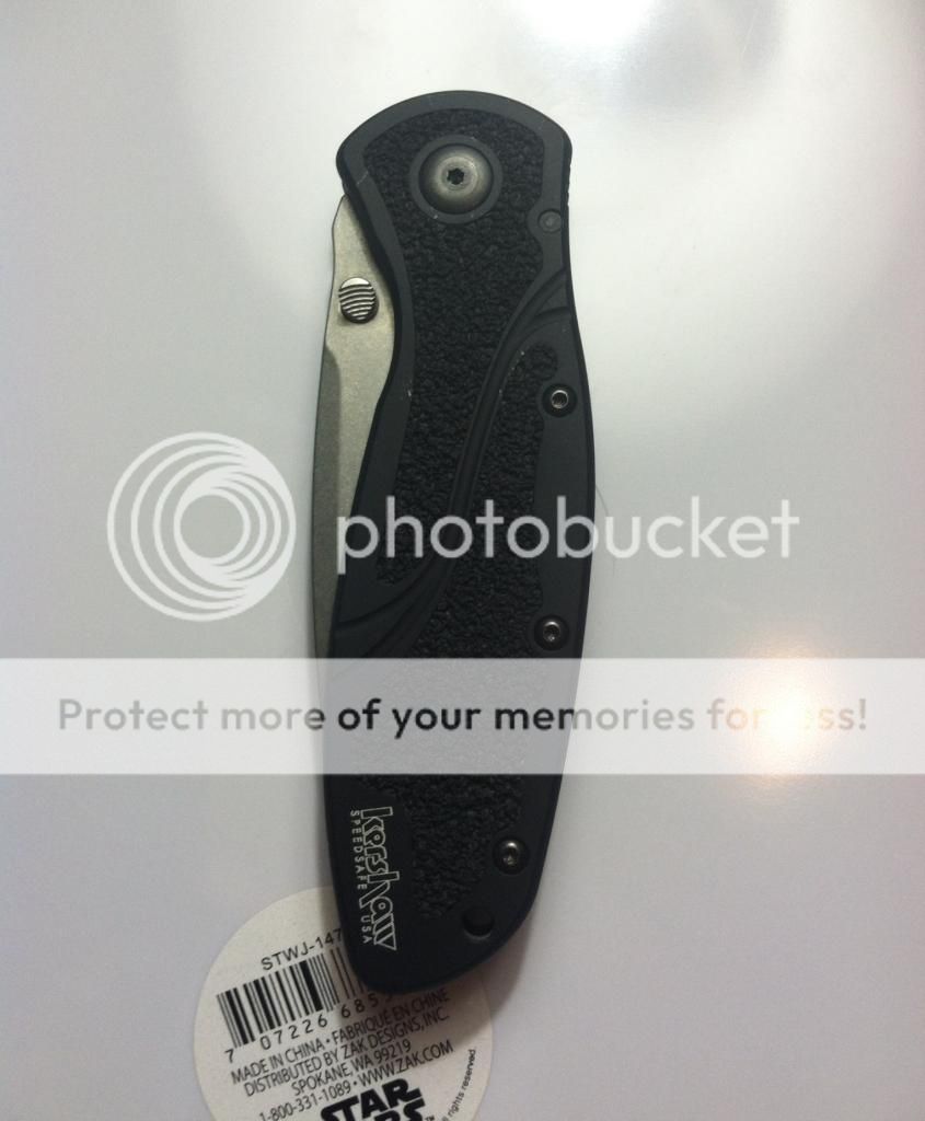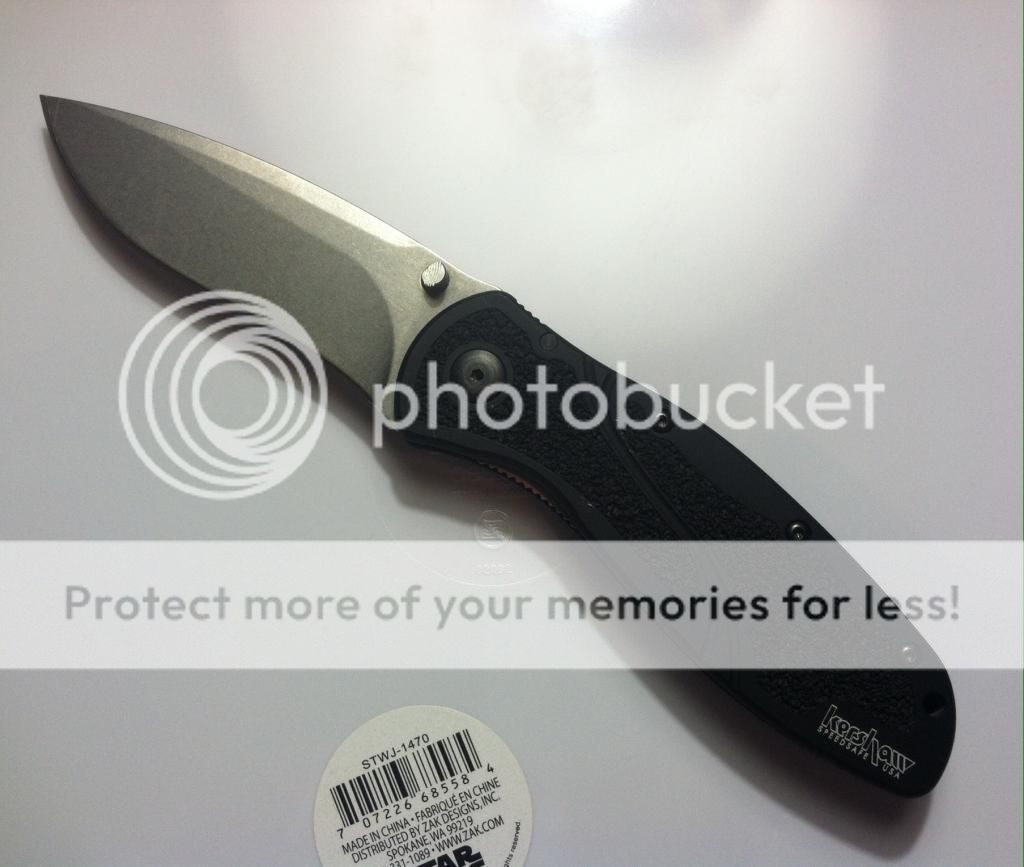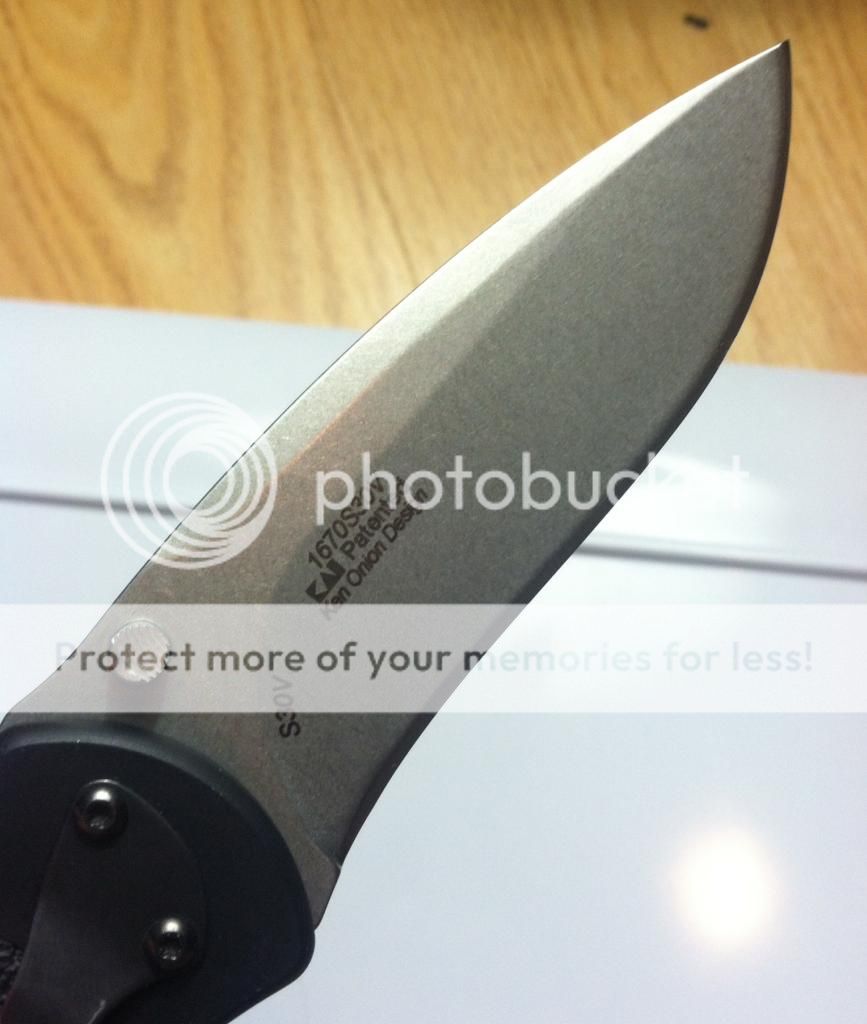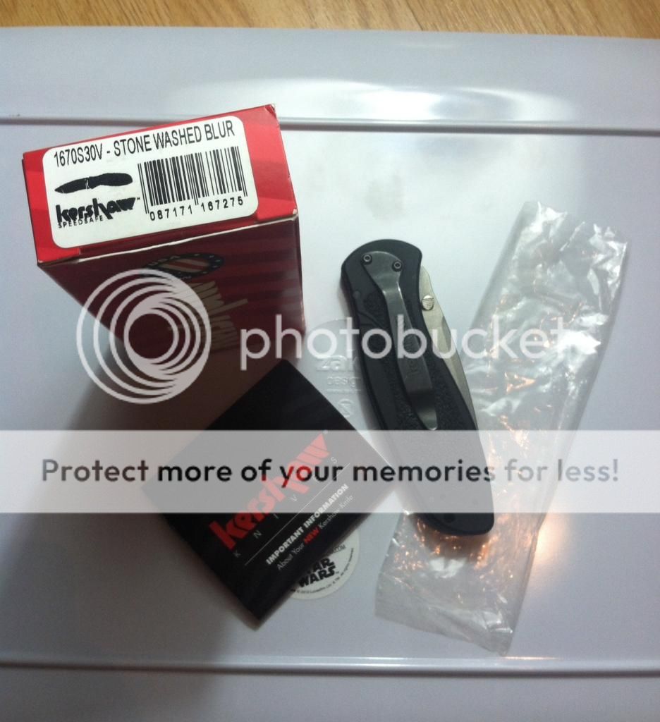 Also For Sale is my lightly used Kershaw S30V Blur. I de-assisted it and the action is smooth. This one doesn't come with the torsion bar but a quick call or email to KAI and they'll ship you the parts for free. Nice, early lock-up. Centered blade that comes very sharp. A few carry marks on the aluminum, but I never cut much with it.