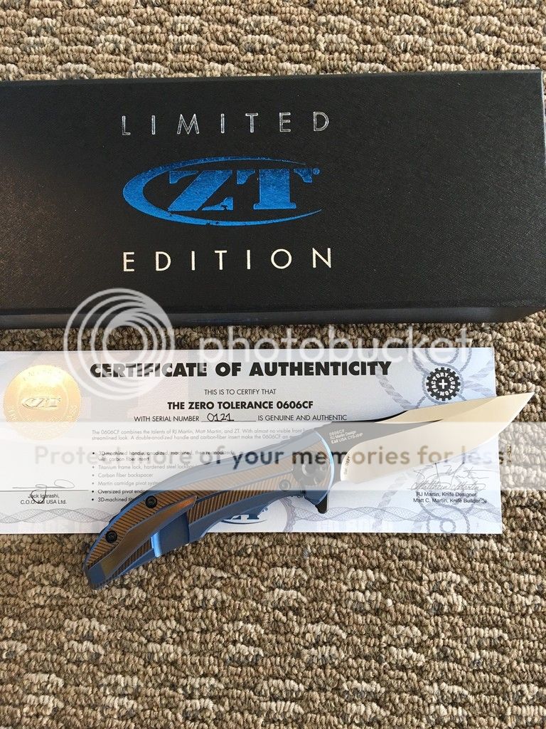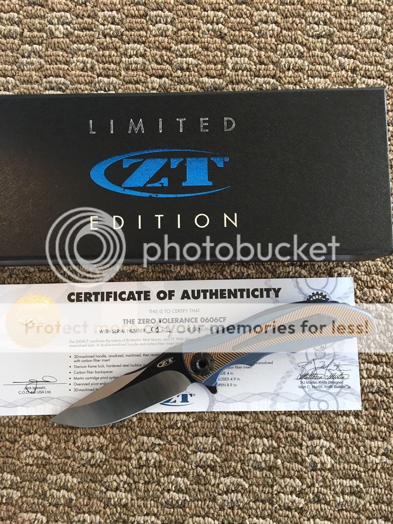 I have a Zero Tolerance 0606CF for sale. It has never been used or carried. Comes with box and all factory paperwork. Selling for sold (includes PayPal fees and shipping). Will only ship CONUS. First "I'll take it" with quick payment get's it. Not interested in trades. Thanks for looking.