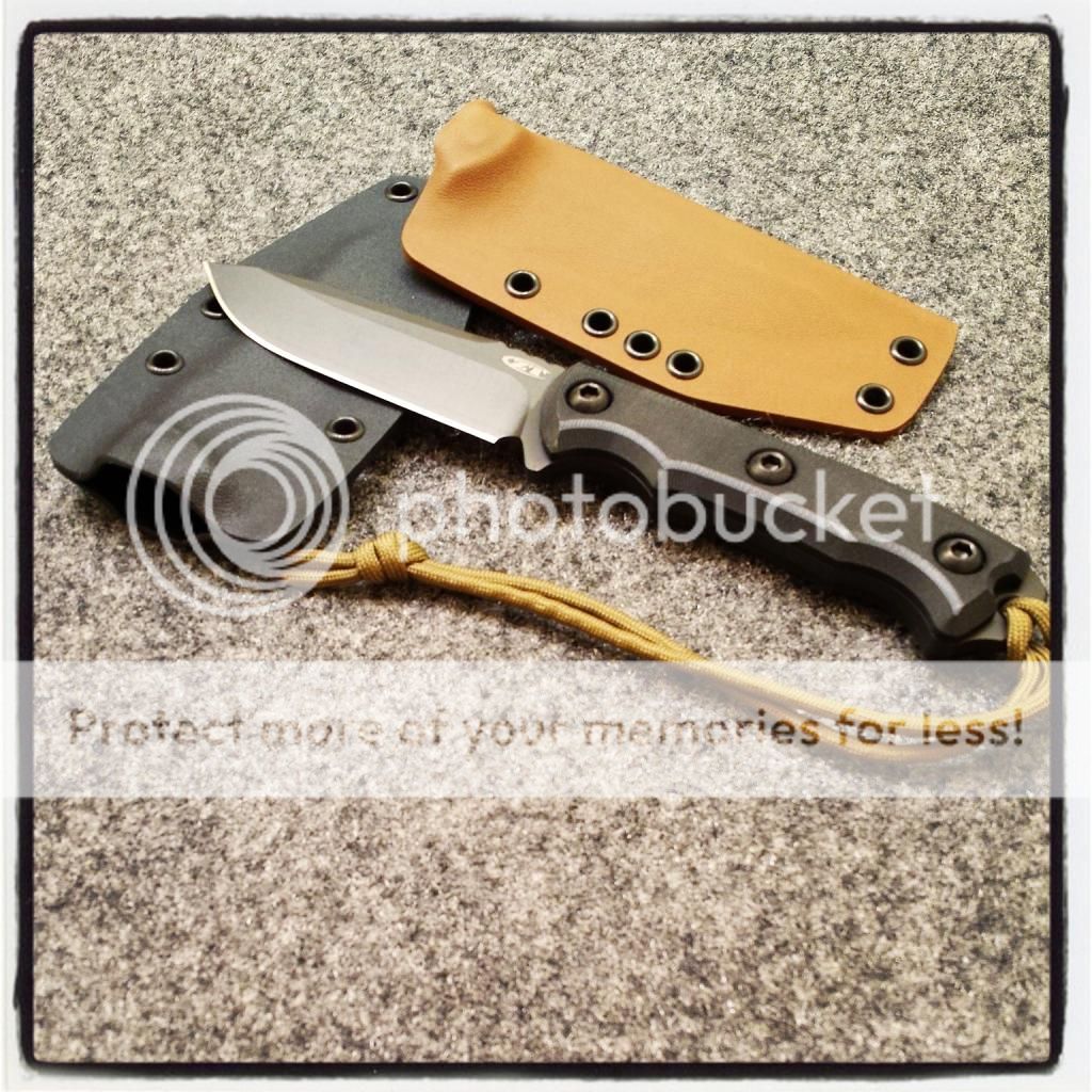 The sheath is horrible, for this knife at least. It's SpecOps standard small or medium sized sheath. The knife wobbles around in the loose plastic insert and the thumb snap. The plastic insert isn't deep enough for this knife, so the knife bottoms out and sits crooked in the sheath and kind of rotates around in the super wide opening until you close the nylon snap holder thing around the handle. The knife is handle heavy, and in the sheath it wants to tip outwards. I think this will be great in a rigid kydex sheath with a Tek-Lok.