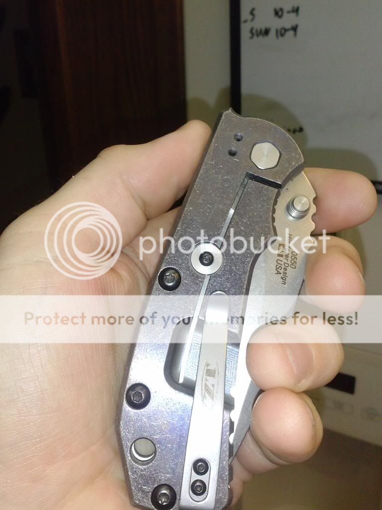 This is my ZT 550 that I altered. I scotchbrite finished the titanium frame, anodized it a blue/purple color, and then stonewashed over the anodizing. The edge was slightly convexed so the edge is ridiculously sharp, maintained on a black compound strop. lockup is solid with no wiggle, action is smooth, great user with little wear on the blade.