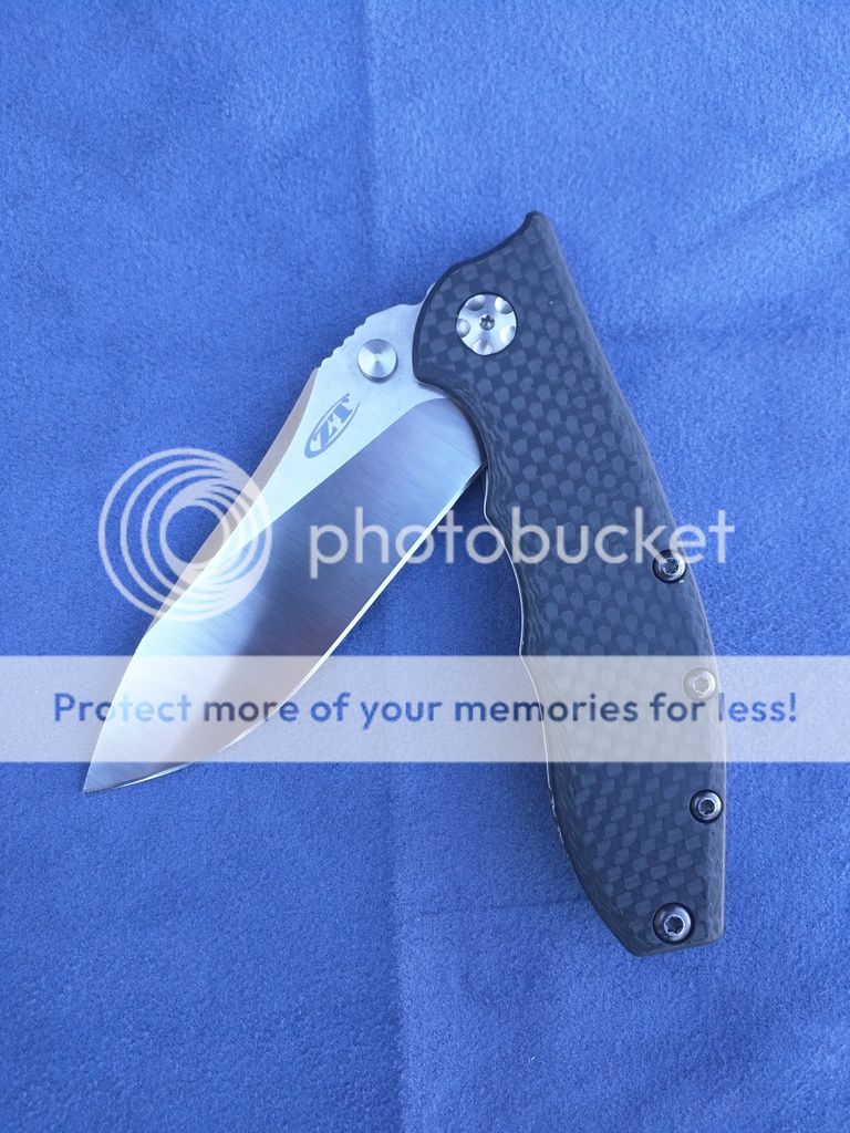 For sale is a lightly used ZT 0562CF with the M390 steel. It also has the older twill pattern in the carbon fiber. Serial number of 0110. Original edge, never sharpened. Very light faint scratches on the blade very difficult to photograph. Rock solid, no blade play, perfect centering. Flips with ease. I am the original owner, and I do have the box. I'm asking $old, includes shipping and PayPal fees. Post you'll take it, PM me, or email me at lonspen at yahoo dot com. No trades please.