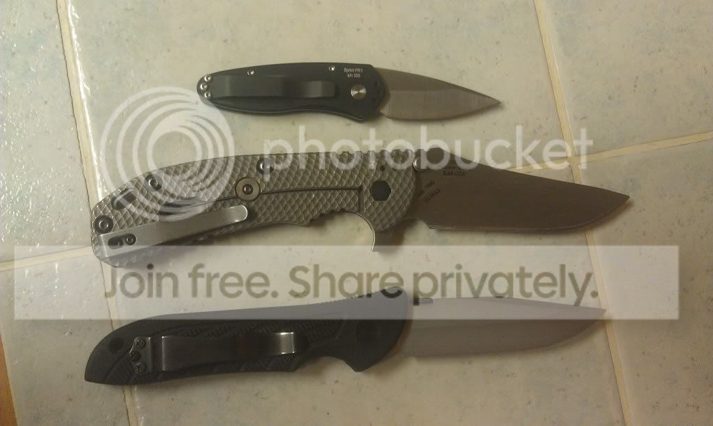 Sprint is gone Second, is a Protech Sprint with a satin blade and black and carbon fiber handles. Fires strong and fast with no blade play. Centered blade. Only cut a few boxes with it so its still shaving sharp. I dropped it the first day I got it (bugger is so small I forgot it was on my lap) so there are few dings on the corners of the handles. Other than that it's a fun little companion blade.