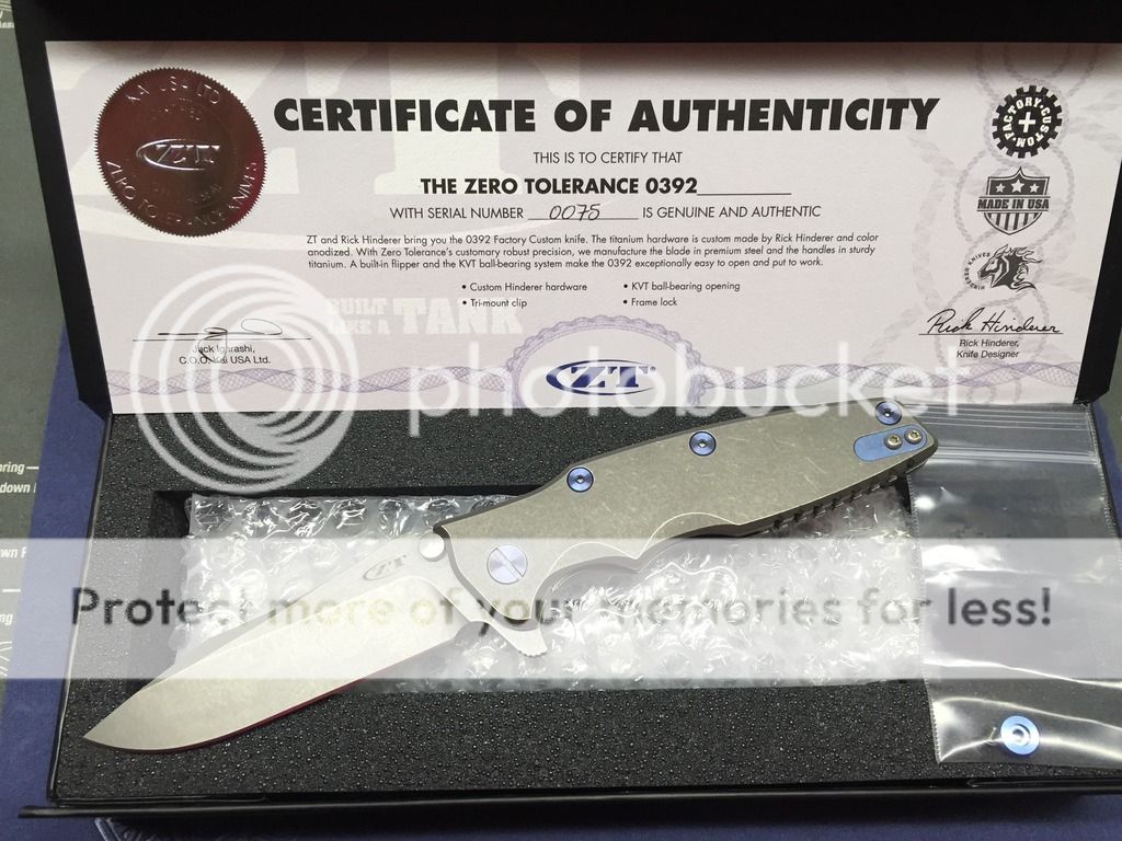 ZT0392 Ser.0075 comes complete with Certificate of authenticity, box, insert, bubble sleeve, extra custom blue lbs disc & screw (original installed), etc. I even have the original ZT cardboard box this knife was shipped in from factory with a bit of extra tape on it.