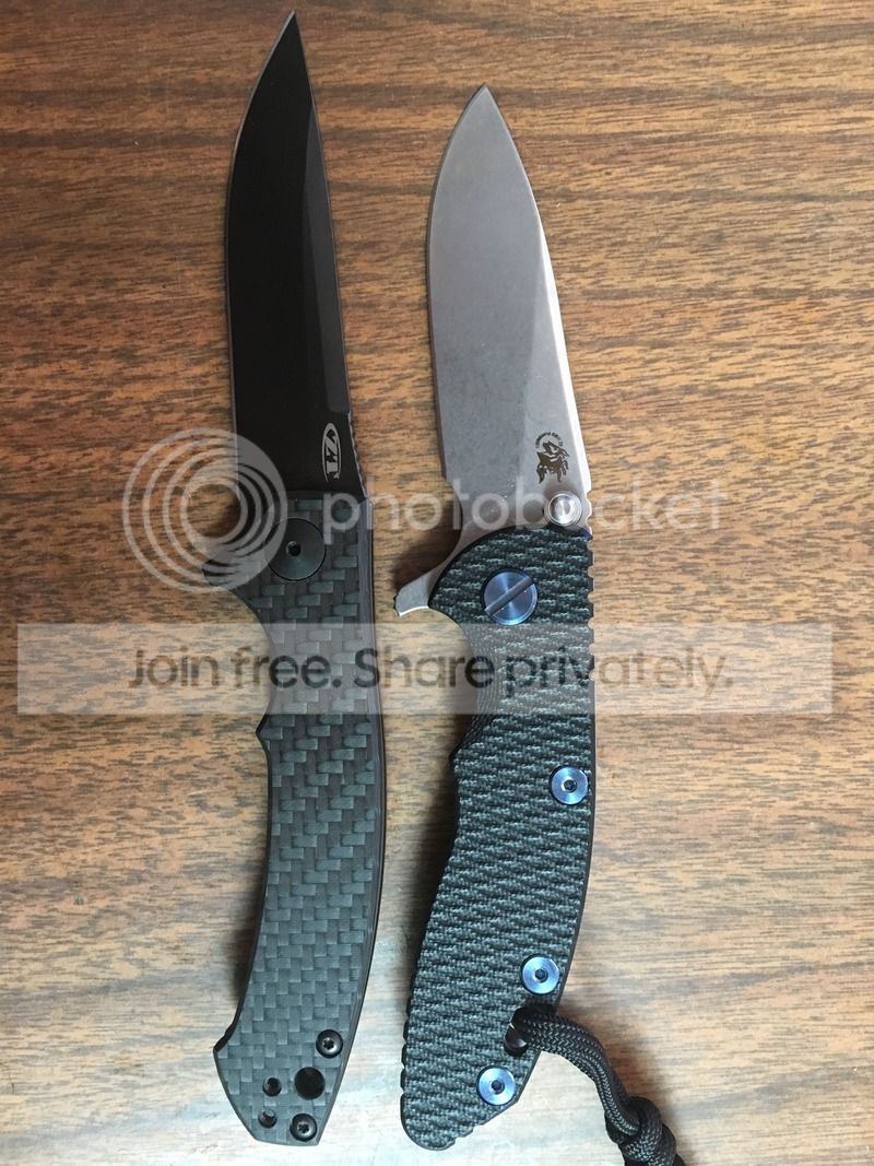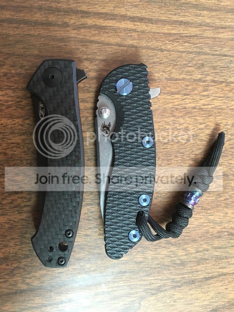 Handles: ZT, carbon fiber very slim. XM18, g10 very grippy.