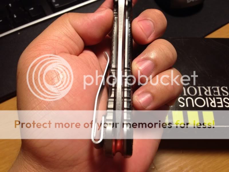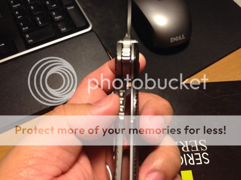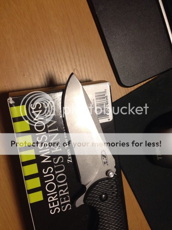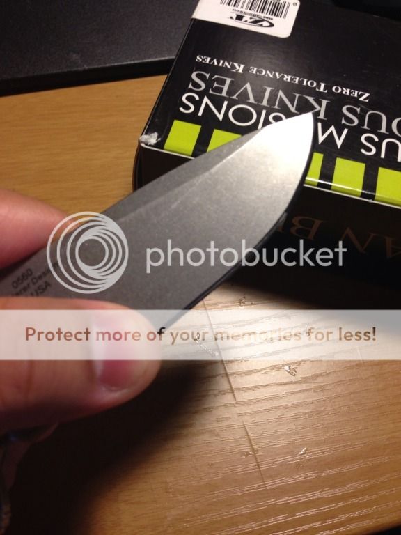 The knife is used and sharpened, it came with the tip broken and i reprofiled the tip to fix it, i suppose it is 0.5 mm shorter than a normal 0560. one tiny tiny chip near the center of the blade and a dimple on one side. and the clip is faded where it says ZT the stand-offs have been coated red, very nice looking